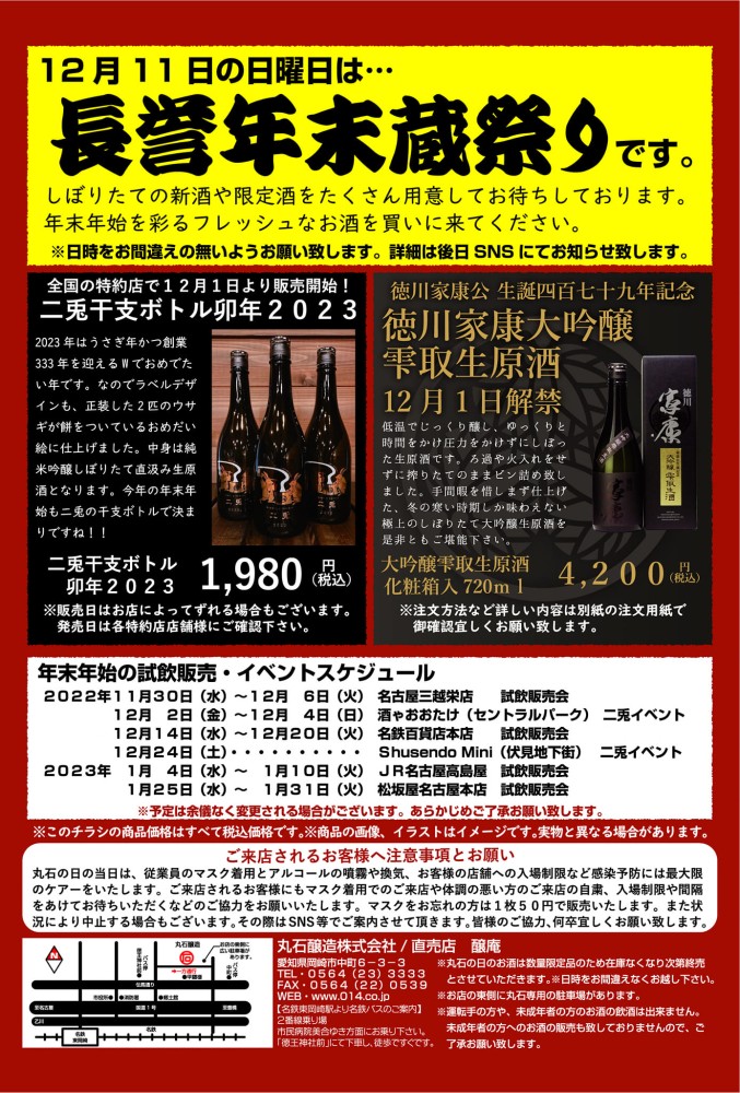 岡崎の山々もお酒に酔ったように黄や赤に染まる季節です。11月はこれまで長誉秋祭りを開催していましたが、今年からしぼりたての新酒や年末年始の限定酒が発売される12月に蔵祭りを移しました。