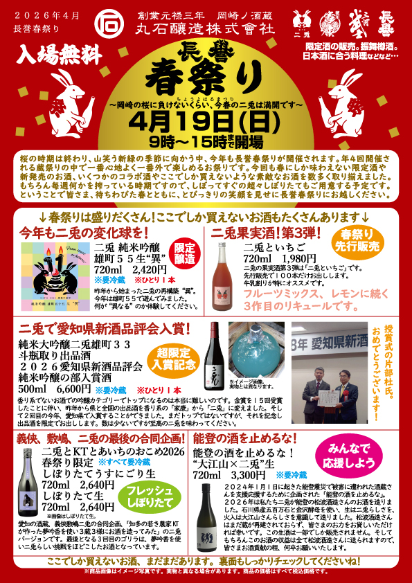 桜の時期は終わり、山笑う新緑の季節に向かう中、今年も長誉春祭りが開催されます。年4回開催される蔵祭りの中で一番心地よく一番外で楽しめるお祭りです。